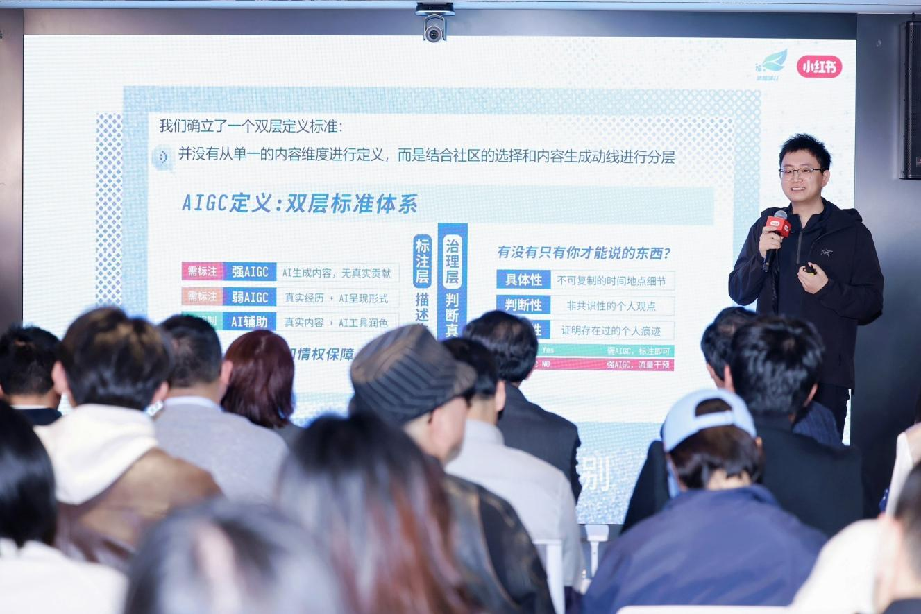 主题分享环节,小红书AI治理负责人刘星围绕平台对AIGC内容的基本态度和治理思路进行了介绍。他表示,面对AIGC快速发展,平台治理的重点不是工具本身,而是“用AI替代真实、消解真实”的行为。对于能够辅助真实表达、提升创作效率的AI应用,平台持开放态度;对于缺乏真实经验支撑、可以被批量复制、削弱用户真实感知和信任基础的内容,平台将持续加强识别、标注和治理。