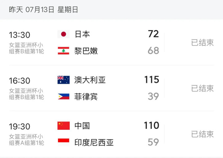 B组这边首轮比赛全部结束!日本女篮72:68艰难险胜黎巴嫩,澳大利亚女篮则轻松大胜菲律宾76分。