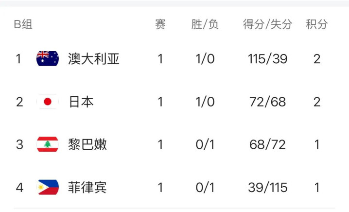 在B组的积分榜上,两支首轮获胜的球队澳大利亚和日本排名前2,第3名则是4分之差输给日本女篮的黎巴嫩女篮。